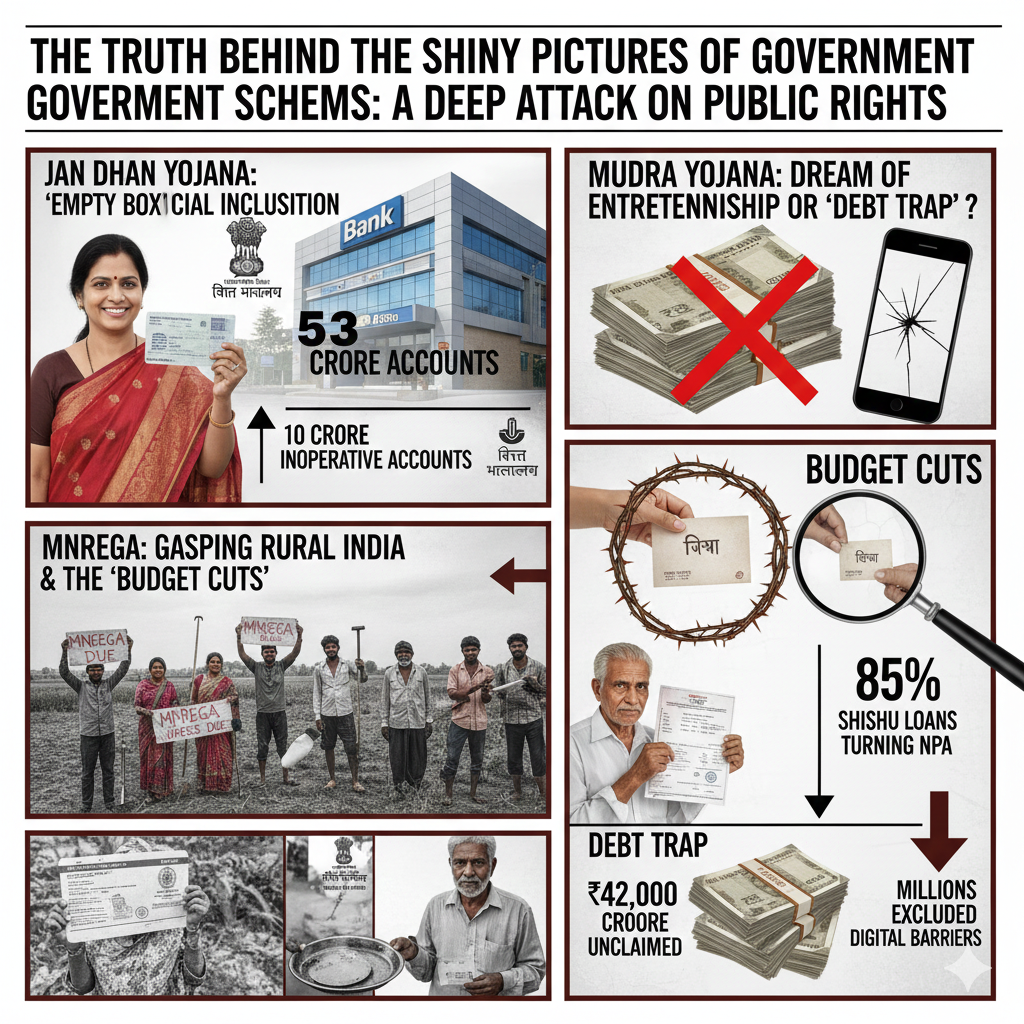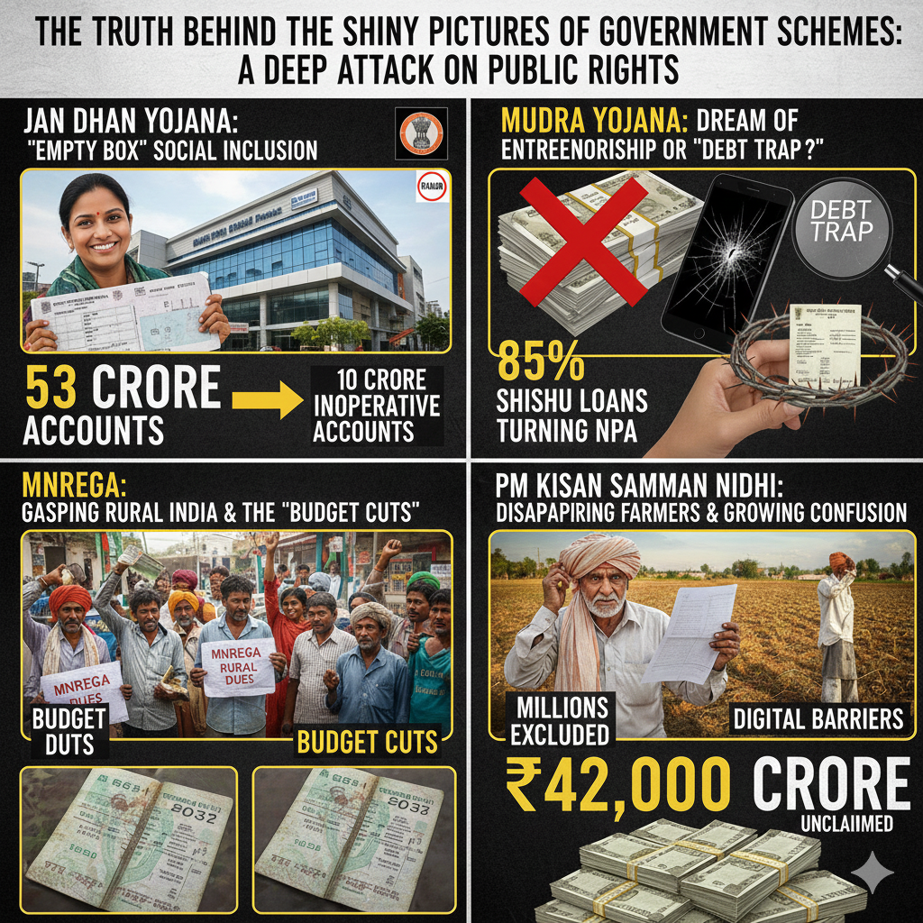 इन सभी योजनाओं—जनधन, मनरेगा, मुद्रा, किसान सम्मान निधि—को जोड़कर देखें तो तस्वीर और भयावह लगती है। कुछ योजनाओं में खाते बंद हो रहे हैं, कुछ में बजट खत्म हो रहा है, कुछ में फर्जी या संदिग्ध लाभार्थी दिख रहे हैं, और कुछ में हर साल बढ़ते हुए खर्च का कोई सामाजिक-आर्थिक असर दिखाई नहीं देता। सवाल यह है कि इतनी विशाल रकम आखिर कहाँ जा रही है? क्या यह पैसा जनता की जेब तक पहुँच पा रहा है या किसी दूसरी आर्थिक संरचना में समा रहा है, जिसे आम नागरिक समझ भी नहीं सकता? योजनाओं के भारी-भरकम दावों और जमीन पर बिखरी हकीकत के बीच का यह अंतर अब देश की राजनीति और अर्थव्यवस्था दोनों पर गंभीर सवाल खड़ा कर रहा है।