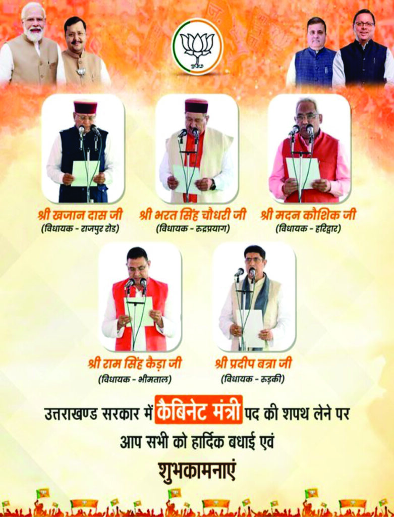 इस विस्तार के साथ ही मुख्यमंत्री पुष्कर सिंह धामी के मंत्रिमंडल में पांच नए मंत्रियों की एंट्री हुई है। लोक भवन में शुक्रवार की सुबह 10रू00 बजे नए मंत्रियों का शपथ ग्रहण समारोह आयोजित किया गया। समारोह में राज्यपाल गुरमीत सिंह ने विधायकों को मंत्री पद की शपथ दिलाई। इस शपथ ग्रहण के बाद धामी मंत्रिमंडल में कुल मंत्रियों की संख्या बढ़कर 12 हो गई है। नए मंत्रियों की सूची में मदन कौशीक, भरत चौधरी, प्रदीप बत्रा, राम सिंह कैड़ा और खजान दास शामिल हैं। यह विस्तार केवल प्रशासनिक कार्यों को सुचारू रूप से चलाने का माध्यम नहीं है, बल्कि यह राजनीतिक स्थिरता, क्षेत्रीय संतुलन और आगामी चुनाव की रणनीति में भी महत्वपूर्ण भूमिका निभाता है।