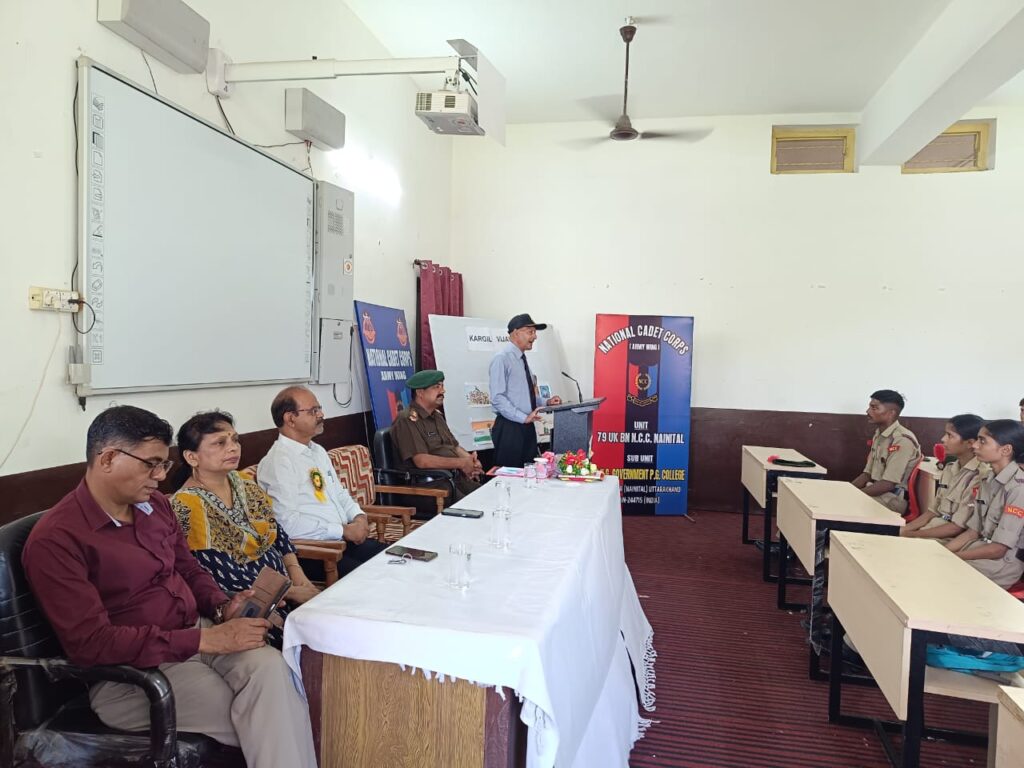 देश की रक्षा में भारतीय सैनिकों की वीरता को रेखांकित करते हुए सूबेदार मेजर नवीन चन्द्र पोखरियाल ने बताया कि इस युद्ध में भारत के 527 वीर सैनिक शहीद हुए, 1363 जवान घायल हुए और एक वीर सैनिक पाकिस्तान द्वारा युद्धबंदी बनाया गया। उन्होंने यह भी बताया कि उत्तराखंड की पवित्र भूमि ने 75 वीर जवान इस युद्ध में खोए, जिनमें नैनीताल जिले के मेजर राजेश अधिकारी (महावीर चक्र), नायक मोहन सिंह (सेना मेडल), लांसनायक चंदन सिंह (सेना मेडल), लांसनायक रामप्रसाद ध्यानी और सिपाही मोहन चन्द्र जोशी शामिल हैं, जिन्होंने देश की रक्षा में अपने प्राणों की आहुति दी और अमर हो गए। उनकी शौर्यगाथा छात्रों को भावुक भी कर गई और प्रेरित भी। उन्होंने युवाओं से आह्वान किया कि वे सेना में शामिल होकर अपने जीवन को राष्ट्र सेवा के लिए समर्पित करें, क्योंकि यह जीवन की सर्वाेच्च तपस्या है।