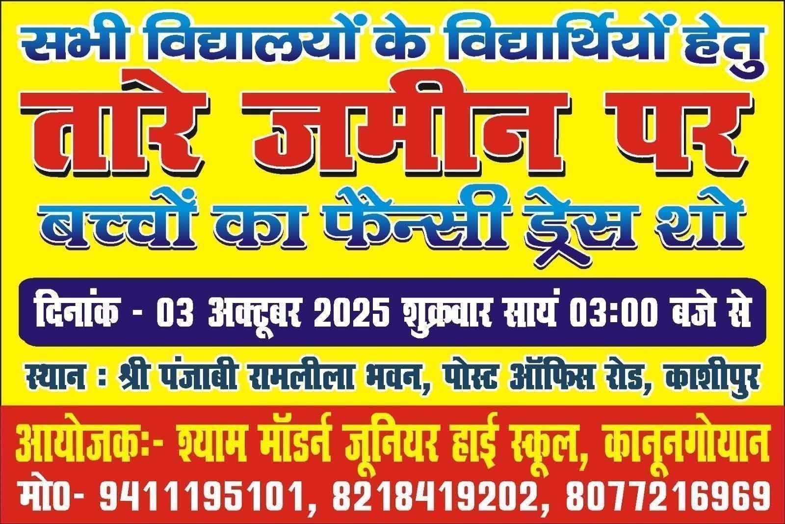 काशीपुर। शहर एक बार फिर शाम मॉडर्न जूनियर हाई स्कूल बच्चों की मासूम प्रतिभा और उनके सपनों को मंच देने की तैयारी में है। यहां आगामी 3 अक्टूबर 2025 की दोपहर तीन बजे से श्री राम-कृष्णा डोमेस्टिक क्लब, पांजीरी रामलीला भवन, पोस्ट ऑफिस रोड पर एक बेहद खास आयोजन किया जाएगा। “तारे ज़मीन पर दृ बच्चों का फैंसी ड्रेस शो” नाम से होने वाला यह कार्यक्रम न सिर्फ बच्चों की अदाकारी, आत्मविश्वास और वेशभूषा का प्रदर्शन करेगा, बल्कि उनकी छिपी हुई कला और प्रस्तुति को भी लोगों के सामने लाने का सुनहरा मौका बनेगा। यह आयोजन बच्चों के लिए एक ऐसा मंच साबित होने जा रहा है, जहां वे नृत्य, अभिनय, भाव-भंगिमा और संवाद शैली के साथ अपने चुने हुए किरदार को जीवंत करेंगे और अपनी मासूम कल्पनाओं को वास्तविकता का रूप देंगे।