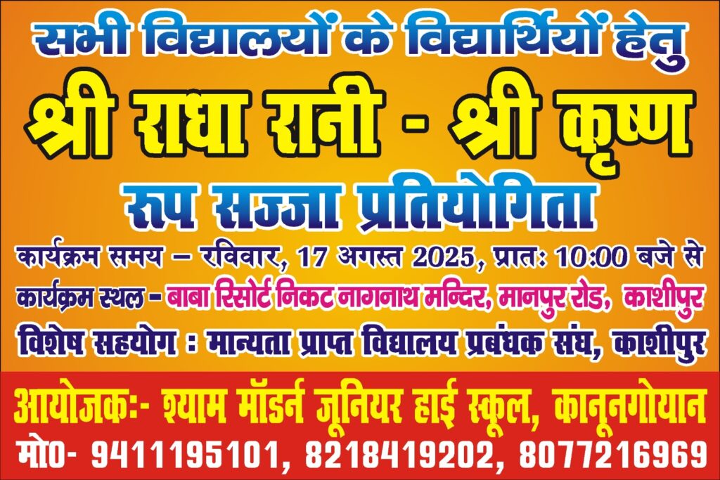 काशीपुर। धार्मिक आस्था और सांस्कृतिक रंगों से सजेगा काशीपुर का बाबा रिसोर्ट, जब शहर के नन्हे-मुन्ने भक्त श्रीकृष्ण और श्री राधा रानी के रूपों में अपनी अनूठी छवि लेकर मंच पर उतरेंगे। यह अनुपम आयोजन 17 अगस्त 2025, रविवार को प्रातः 10:00 बजे से बाबा रिसोर्ट, मानपुर रोड, निकट नागनाथ मंदिर, काशीपुर में आयोजित किया जा रहा है। इस खास कार्यक्रम को “श्री राधा रानी – श्री कृष्ण रूप सज्जा प्रतियोगिता” के नाम से पहचाना जा रहा है, जो इस बार काशीपुर के सांस्कृतिक कैलेंडर में विशेष स्थान बनाने जा रहा है। आयोजन को श्याम मॉडर्न जूनियर हाईस्कूल, लुहारो बाली गली, कानूनगोयान काशीपुर के सौजन्य से संचालित किया जा रहा है, जिसमें बच्चों को न केवल अपनी प्रतिभा दिखाने का अवसर मिलेगा, बल्कि भक्ति और संस्कृति से भी उनका जुड़ाव गहराएगा।