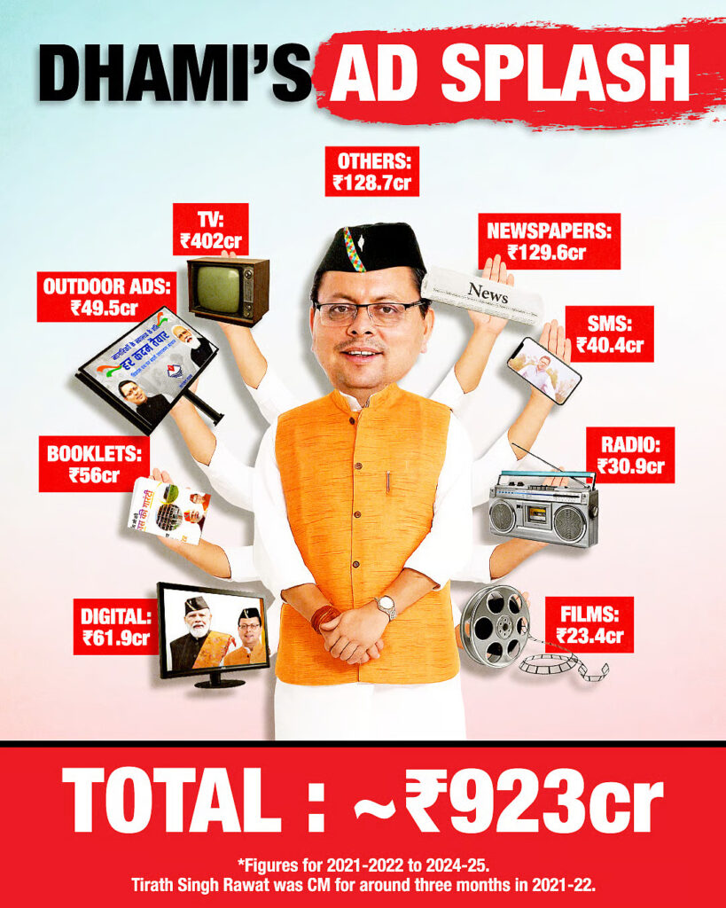 सरकार के दस्तावेज बताते हैं कि प्रचार-प्रसार के इस सिलसिले में सबसे बड़ा हिस्सा टेलीविजन मीडिया को मिला है। पिछले पांच वर्षों में राज्य सरकार ने टीवी चौनलों को कुल 427 करोड़ रुपये के विज्ञापन दिए हैं। इनमें से 402 करोड़ रुपये सिर्फ पिछले चार सालों में जारी किए गए, यानी वह समय जब पुष्कर सिंह धामी मुख्यमंत्री की कुर्सी पर थे। टेलीविजन के बाद सबसे बड़ा खर्च समाचार पत्रों, डिजिटल प्लेटफॉर्म और आउटडोर मीडिया पर हुआ। अखबारों को 129.6 करोड़ रुपये, डिजिटल विज्ञापनों पर 61.9 करोड़, रेडियो पर 30.9 करोड़, फिल्म और थिएटर विज्ञापनों पर 23.4 करोड़, जबकि एसएमएस, बैनर और पुस्तिकाओं पर 226 करोड़ रुपये से अधिक की राशि खर्च की गई।